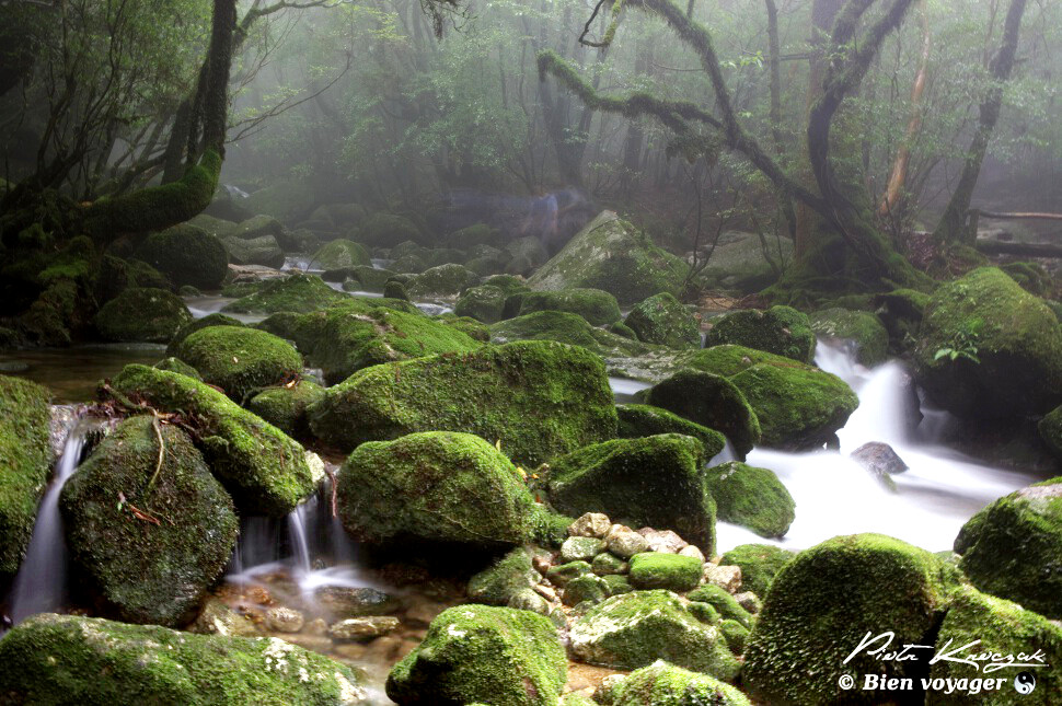 #Japon – Yakushima. Shiratani unsui-kyō. Mononoke-hime. Paysage drapé de brume. Atmosphère gorgée d’eau presque suffocante. Un murmure dans l’air comme si 1000 cascades nous encerclaient. On pénètre dans une cathédrale verdoyante avec un silence religieux. C’est irréel, enchanteur, magique. Magique oui, un mot usé pour une forêt trempée. On l’appelle également la forêt Mononoké car elle a inspiré le réalisateur Miyazaki pour son film… on y trouve les plus vieux cèdres du Japon. Certains ont, selon la légende locale, plusieurs millénaires. La balade de quelques heures est un vrai délice… on peut également faire un trek de plusieurs jours jusqu’au sommet de l’île… Nous n’y sommes restés, avec regret, qu’une seule journée… il faudra y revenir. Infos utiles sur Yakushima en fin d’article.