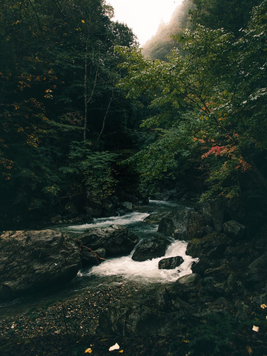 L’atmosphère était brumeuse, pluvieuse, loin d’être idéale pour les photos ou la vidéo mais j’étais néanmoins enchanté de me trouver pour quelques heures dans les Alpes japonaises. Il y a ce silence de la pluie qui engloutit les sons lorsque tu enfonces ta tête dans ta capuche. Toc Toc toque la pluie à la porte de notre monde intérieur pour nous faire entrer dans le sien.