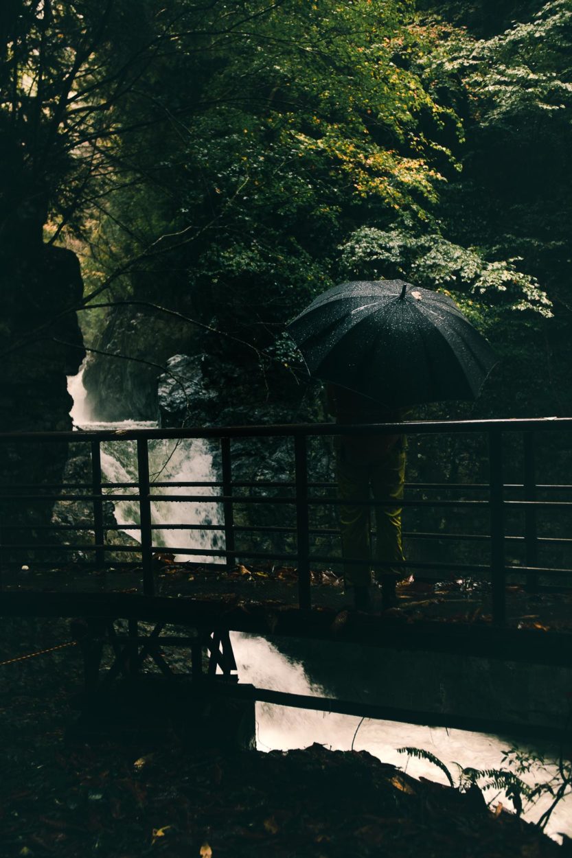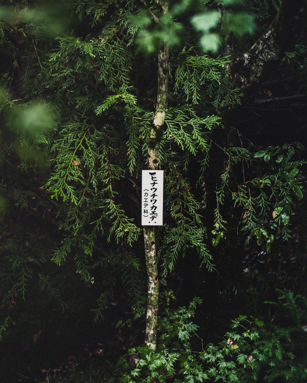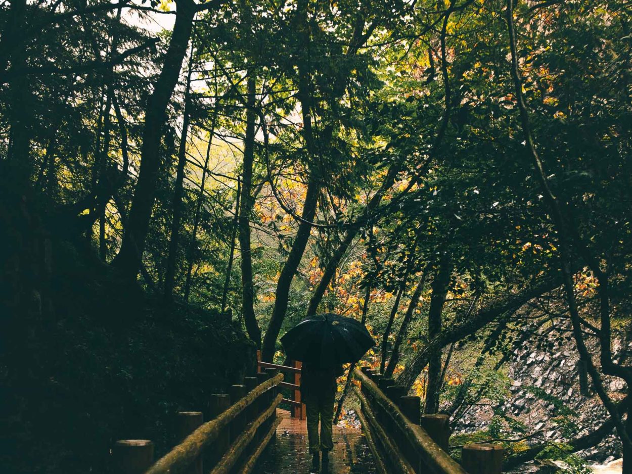 Un typhon qui ne devait plus se trouver là à cette saison traversait le pays nippon. Des averses torrentielles au menu. Il en fallait cependant davantage pour nous démotiver. Équipés de pantalons et de k-way empruntés dans le refuge à côté du parking quasiment désert, on était prêt à arpenter le sentier boisé.