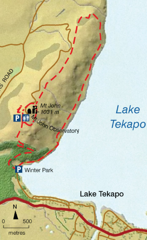 Il correspond au chemin n.9 sur la carte des balades autour du lac Tekapo. Il se situe à l’ouest de l’Eglise, sur la rive opposée à celle du Mont John.