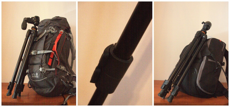 à gauche ce que donne mon trépied porté sur un sac d’expé Jack Wolfskin, à droite, sur mon sac photo Manfrotto bon pour une rando à la journée