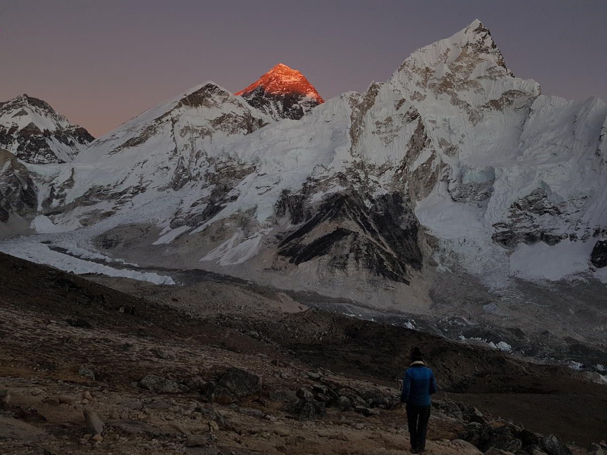 Au Népal j’ai vu une langue de feu sur le plus haut sommet du monde. Comme rougie par les dieux. Je l’ai vu descendant, seul, éclairé par ma maigre lampe torche au milieu des froides roches coupantes sombrant dans le sommeil de la nuit, à plus de 5000m, sur les pentes du Kala Pattar.