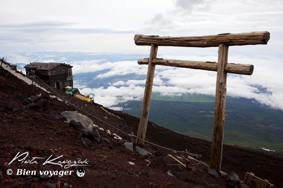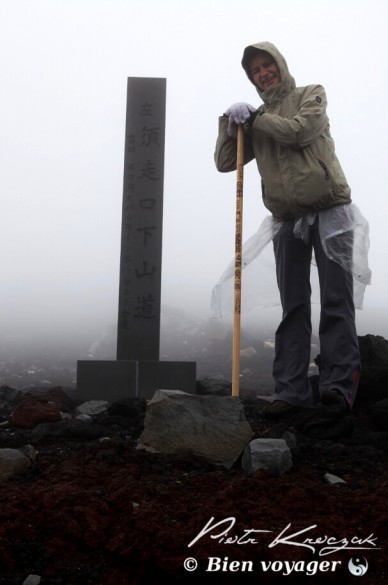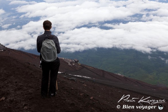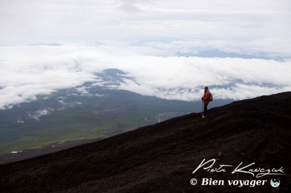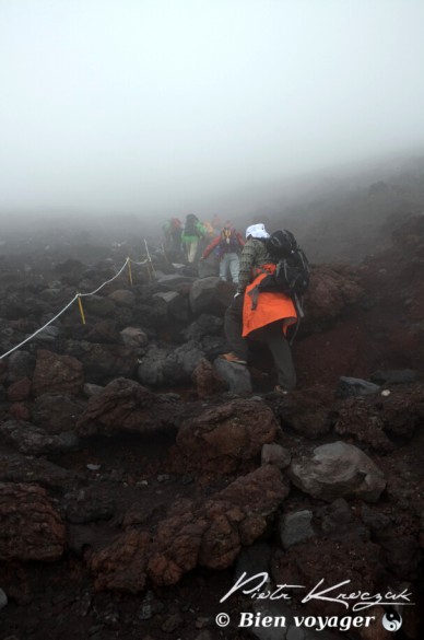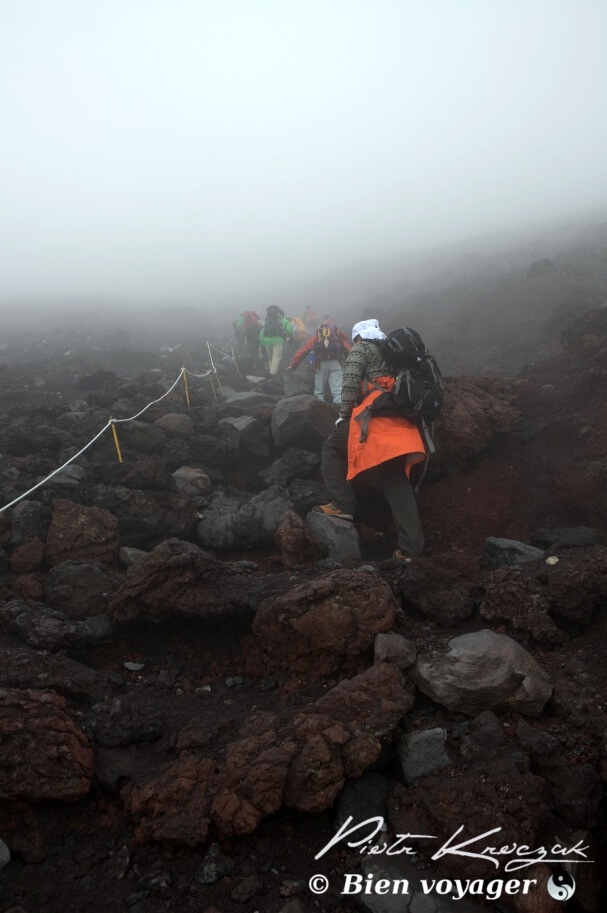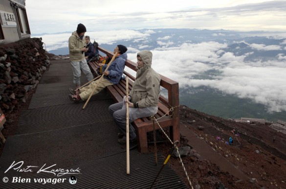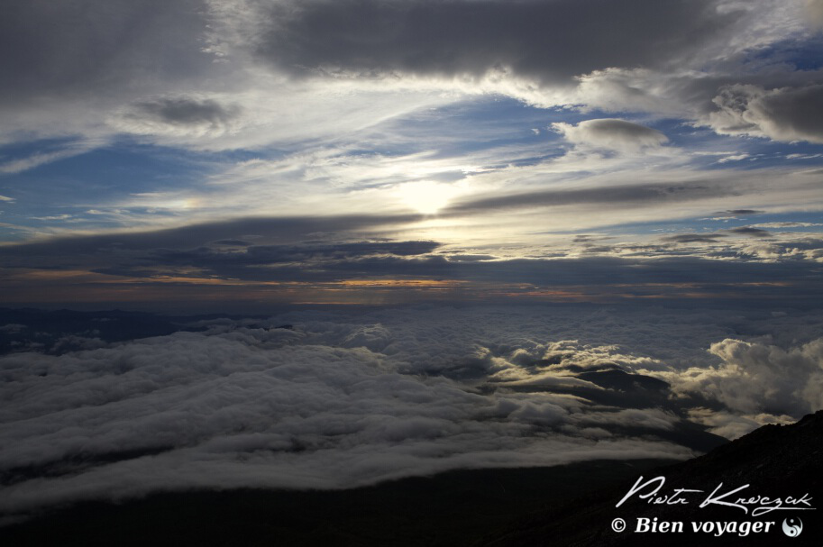Deux petites heures plus tard, gavés de boules de riz, nous voici… quelque part au sommet je suppose. Le brouillard était telle que l’on n’y voyait rien. Certains estiment que c’est du “gâchis“ de grimper sans assister au lever du soleil. Mon avis est moins catégorique. Nous n’avons pas la météo idéale sur commande et la montée reste un épreuve d’endurance intéressante. La vue en redescendant du Mont Fuji, bien que moins magistrale qu’au sommet, reste un délice.