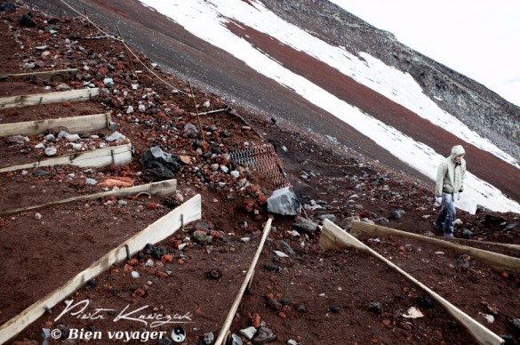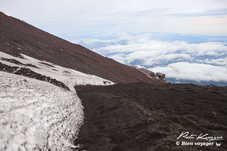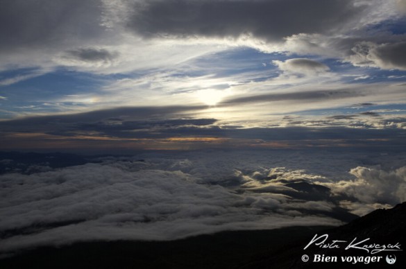 Le lendemain, après avoir tenté de se reposer dans les sacs de couchage à côté d’un japonais ronfleur, le ckeck-out obligatoire à 5h du matin n’était pas le plus agréable. Qu’à cela ne tienne, le temps s’est éclairci, du moins, il ne pleut plus. Je me sens frais comme une gazelle. On est reparti vers le sommet.