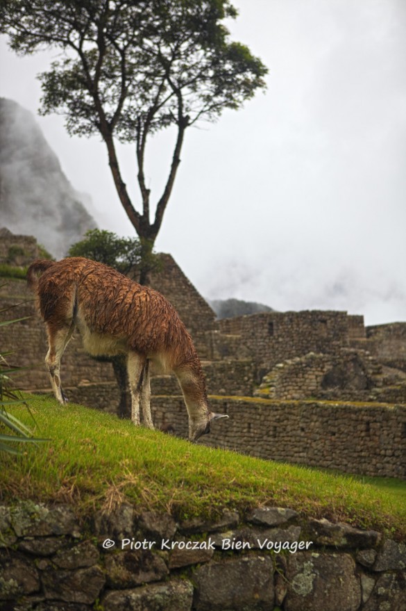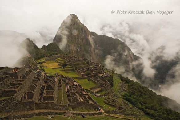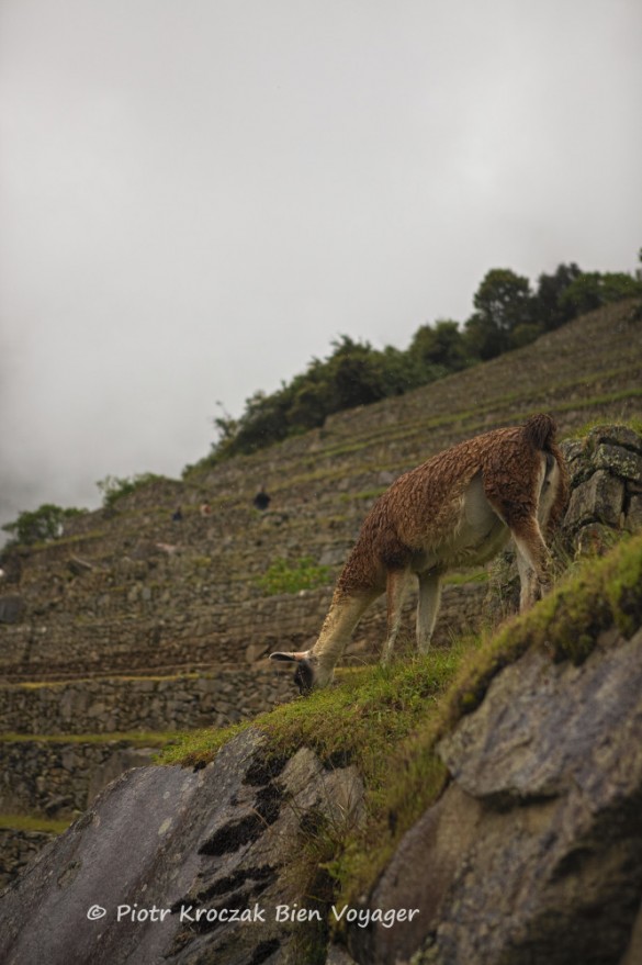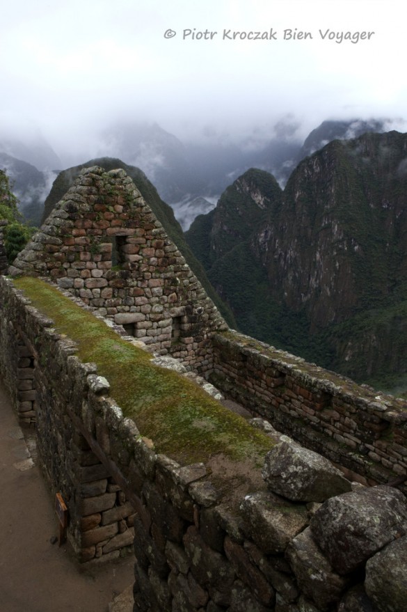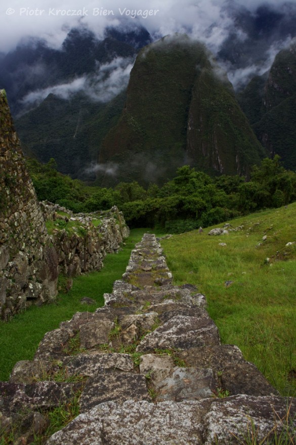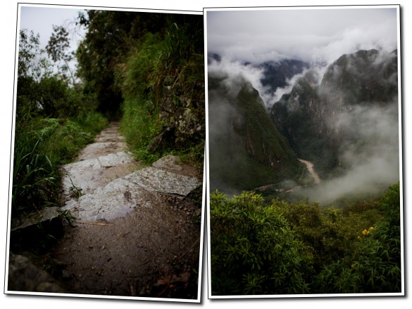 5h45. Je commence l’ascension des marches du Machu Picchu. Il pleut à grosses goutte. Au bout de 30 minutes je vois trouble. Première glissade sur une pierre et je me plante dans la végétation. Pause. J’entends les premiers bus qui montent. Je pense aux passagers à bord. 3 jeunes allemands me dépassent . Eux, ils n’ont pas de sacs mais soufflent et souffrent comme moi. Je reprends mon ascension vitesse tortue. Je n’ai plus d’eau. Je prélève de l’eau de ruissellement et j’y ajoute du micropur. Je reprends mon ascension. 15 minutes plus tard je glisse de nouveau et je roule sur quelques marches telle une vulgaire patate. J’hurle de rage, seul, trempé, dans la boue. Je me calme quelques longues marches plus loin sous un abris. Ouf, mon matériel va bien. J’ai un bon sac heureusement (je vous en reparlerai 😉 La pluie s’arrête quelques minutes et j’ai une première vue de la majestueuse vallée à travers un trou dans la couverture végétale. Je m’arrête et je contemple. C’est beau.