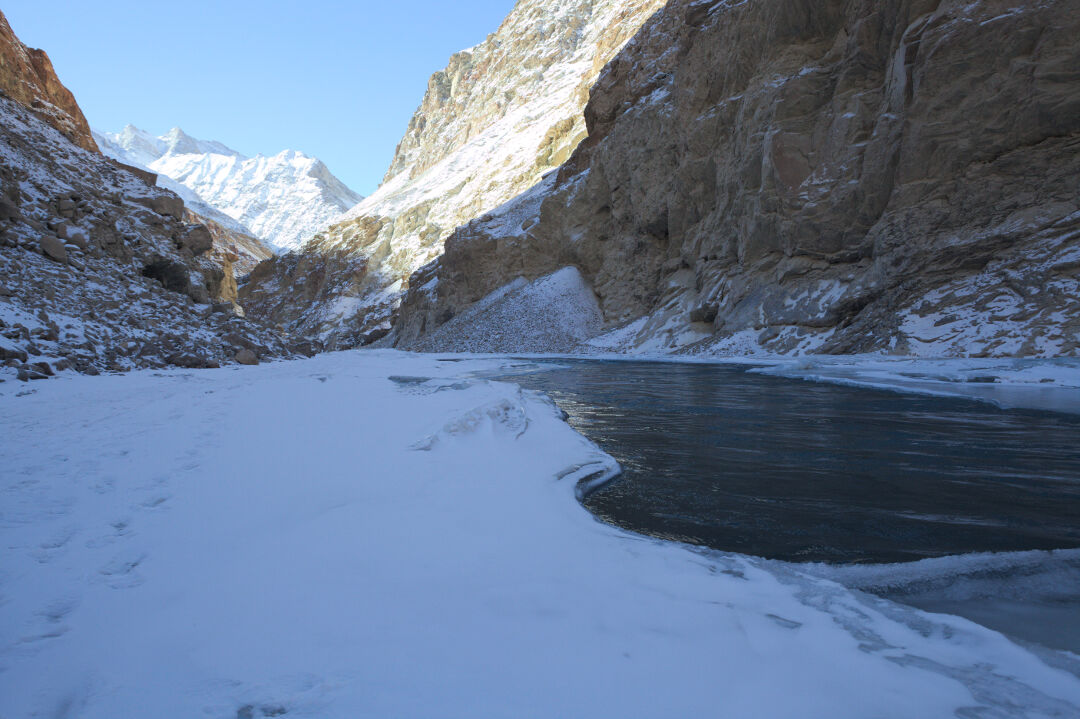 Je ferai un mauvais moine. Je suis trop impatient. Je ne sais pas apprécier l’instant, il me faut toujours avancer. Avancer et vite. Je ne souhaitais pas de porteur pour m’aider. Je suerai donc sur le Chadar. Ce fleuve gelé, le prendre un peu comme un défi sportif. Le mériter, le subir. Et puis j’aime aller à mon rythme. Avaler les paysages, faisant fi du danger qui pèse à chaque pas en marchant sur la glace parfois tenue au dessus du fleuve bouillonnant. Stupide insouciance. Même si j’aurai pu m’adapter, avec quelques efforts, à leur rythme mesuré, mes compagnons indiens étaient également trop bavards, trop bruyants à mon goût. Or je vis les longues marches comme une méditation. De là peut-être ma volonté de faire souffrir ce corps pendant qu’il le peut encore. Alors que hurlent mes musclent endoloris, mon esprit s’évade et s’élève.