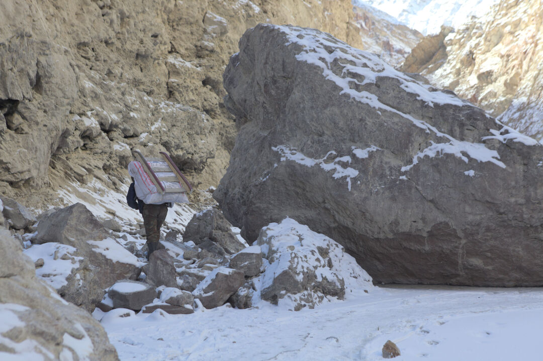 Égoïstement peut-être, je souhaitais avoir le Chadar pour moi tout seul. Amant possessif à la barbe clairsemée. Ne pas partager cette communion avec les éléments, cette délicieuse sensation de vivre une aventure au bout du monde, d’avoir la possibilité, durant quelques brefs mais splendides instants, de devenir enfin l’explorateur de mon destin. Et ce froid mordant et les gifles glacées me faisaient sentir léger, si léger. Je cavalais sur la glace tel un jeune mustang lâché sur les plaines. On m’avait bien évidemment assigné un guide qui me suivait au loin, essayant de tempérer comme il le pouvait les ardeurs de ce touriste inconscient. Il avait cette patience désarmante de m’écouter, alors que , tel un drogué, je le suppliais de continuer à avancer à marche forcée. Je marchais chaque jour comme possédé par la Chadar. En plus de mon sac, je décidais également de tirer un traîneau que j’alourdissais quotidiennement. Toujours dans la volonté de vivre cette aventure comme je pensais qu’elle devait l’être. Il en résulta très peu d’images. Enfin, beaucoup moins que ce qui est censé être l’aventure d’une vie. Mon appareil sommeillait dans mon sac. Ma préoccupation principale était de voir où chaque pas me mènerait. Les jours fuyaient, plus froids les uns que les autres. Rares étaient les rencontres en chemin. Les camps du soir, éphémères chaleurs entre les serres de l’hiver.